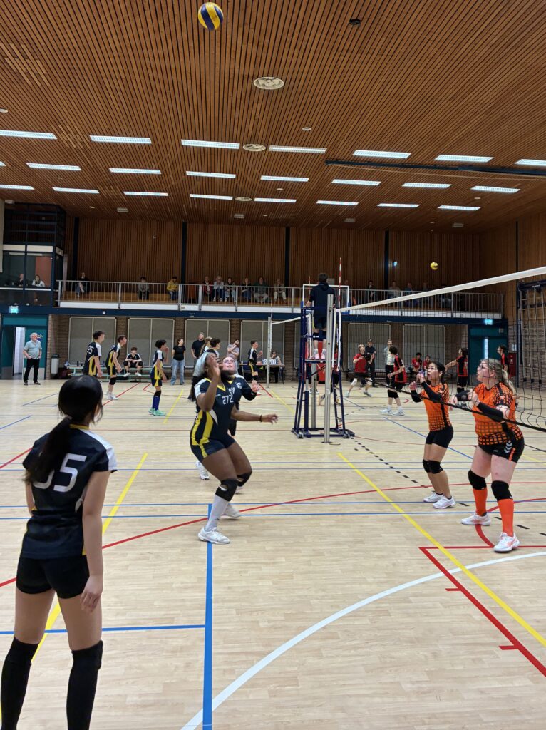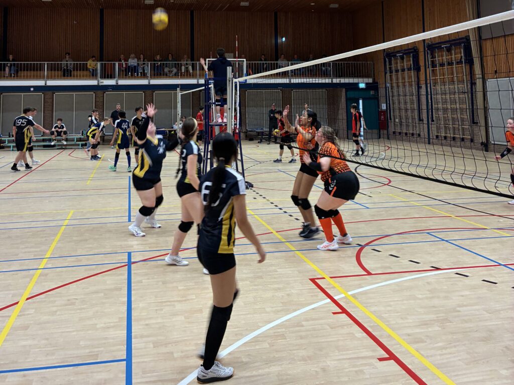De wedstrijd van JA1 liep 20 minuten uit, dus onze meiden en de meiden van VHZ konden om 14:50 uur beginnen met de warming-up en het inspelen. Gelukkig had de scheidsrechter geen haast en kon er ook rustig worden warmgedraaid met inslaan en serveren.